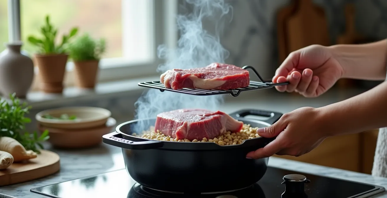 - Fumage express en cocotte : Placez les morceaux de viande égouttés dans une cocotte sur une grille. Au fond, déposez de la sciure de bois (votre « blend » personnalisé) dans une papillote d’aluminium percée. Chauffez la cocotte jusqu’à ce que la sciure fume, puis couvrez et laissez fumer hors du feu pendant 15-20 minutes.