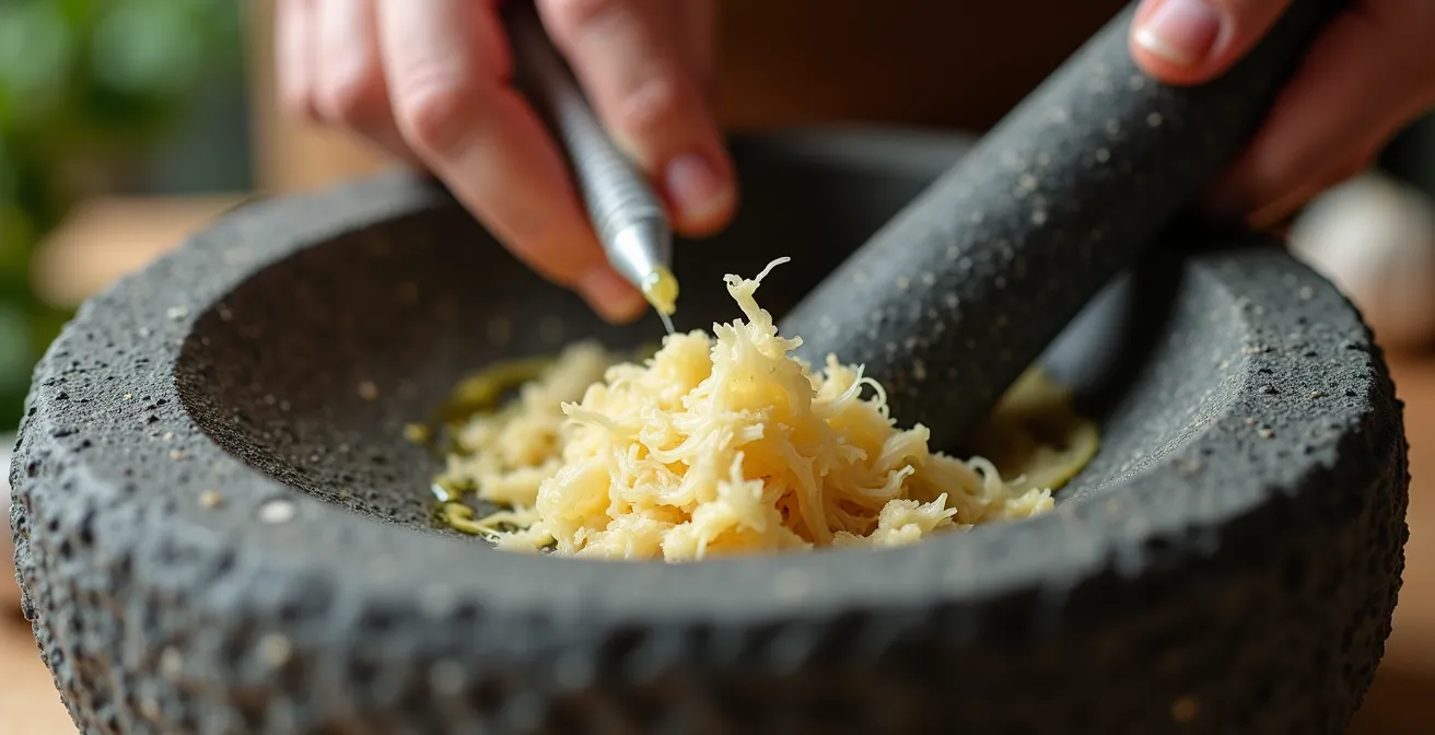 Le goût supérieur d’une préparation au pilon n’est pas une illusion : c’est le résultat direct d’une déchirure des fibres cellulaires que la lame d’un mixeur ne peut reproduire.