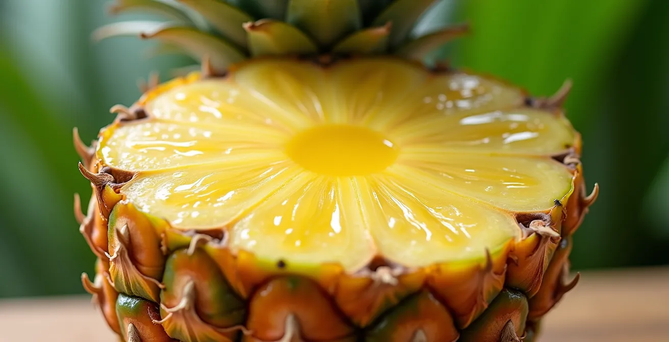 L’une des différences les plus marquantes, et souvent une révélation pour ceux qui le découvrent, réside au centre même du fruit. Alors que la plupart des ananas, comme le Cayenne Lisse ou le MD2 (vendu sous le nom « Gold »), possèdent un cœur cylindrique, fibreux et dur que l’on doit systématiquement retirer, celui du Victoria est une tout autre histoire. Ce cœur est non seulement tendre et juteux, mais il est parfaitement comestible et participe pleinement au plaisir de la dégustation. Cette caractéristique n’est pas anecdotique ; elle change radicalement la manière de préparer et de consommer le fruit, offrant un rendement en chair bien supérieur.